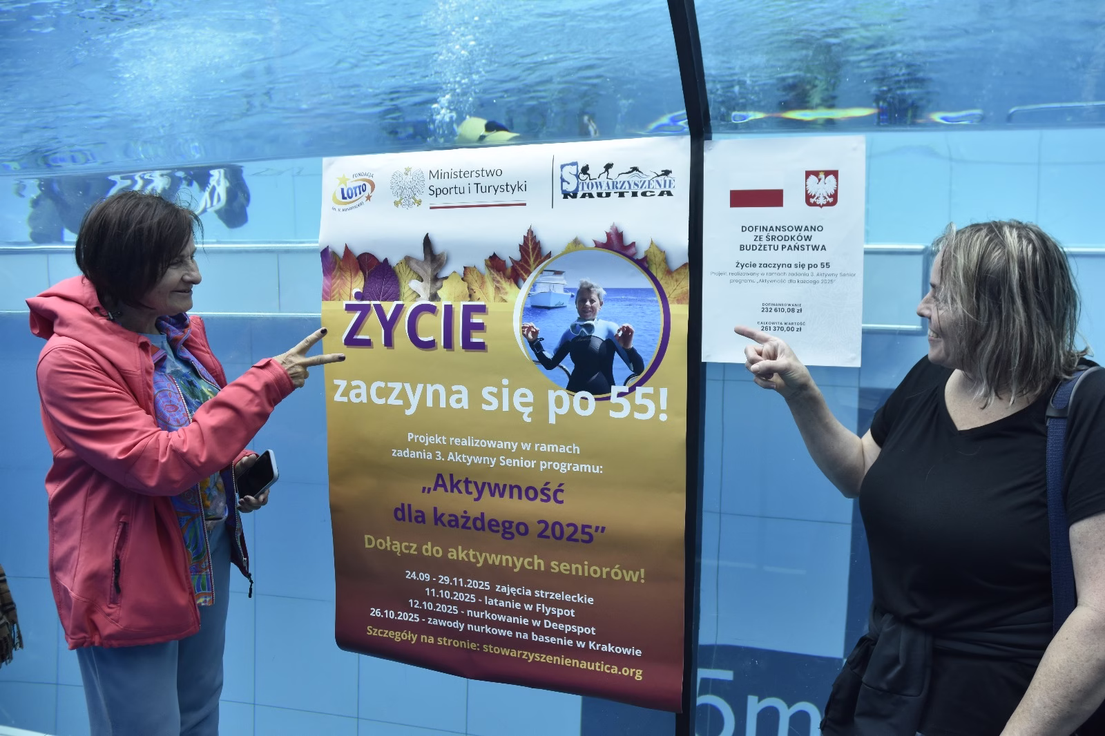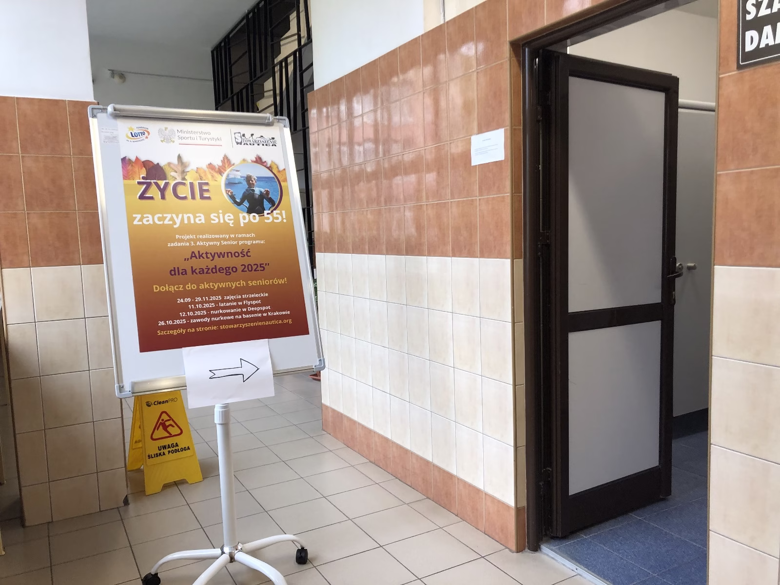 Zadanie polegało na zorganizowaniu dwudniowego wyjazdu dla 30 „seniorów”, w wieku powyżej 55 lat, w tym z niepełnosprawnościami [OzN] wraz z wolontariuszami i kadrą instruktorów nurkowania, gdzie podopieczni mieli możliwość nurkowania w basenie Deepspot w Mszczonowie (najgłębszym basenie w Europie) oraz mieli możliwość „fruwania” (wrażenie skoku spadochronowego) w tunelu aerodynamicznym w Morach. Dla zainteresowanych uczestników imprezy przeprowadzono szkolenie teoretyczne oraz warsztaty z posługiwania się nadciśnieniową maską pełnotwarzową. Celem zadania było zwiększenie aktywności sportowej oraz integracji społecznej seniorów poprzez udział w imprezie rekreacyjno-sportowej, wspieranie i utrzymywanie kontaktu z otoczeniem, promocja sportu osób starszych (w tym OzN) i rozwój wolontariatu.